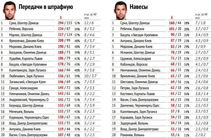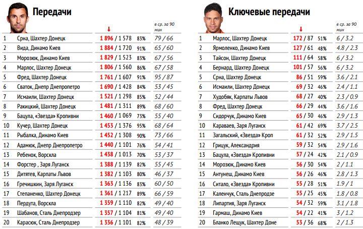 По количеству выполненных передач в чемпионате Украины лидируют два хорватских защитника – Дарио Срна и Домагой Вида (1896 и 1884 соответственно). Вида же является автором наибольшего числа точных пасов – 1720.
