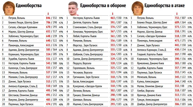 В наибольшее количество единоборств вступал Сергей Петров из Волыни. Форвард целых 846 раз боролся за мяч, что на 140 больше нежели у второго в этой категории Бланко-Лещука. Однако Петров сумел выиграть всего 332 единоборства, что составляет 39% от общего количества.
