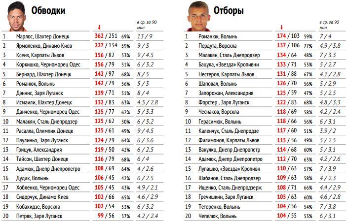 А вот в плане отбора мяча, представителей сильнейших клубов Украины — нет. Лидером по количеству попыток отобрать мяч является 20-летний защитник Волыни Юрий Романюк (174).