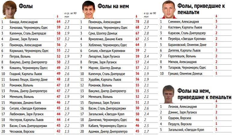 Чаще других терпел нарушения на себе форвард Александрии Виталий Пономарь (78). Капитаны Динамо и Шахтера – Андрей Ярмоленко и Дарио Срна – разделили 3-4 строчку с 67 фолами против них.
