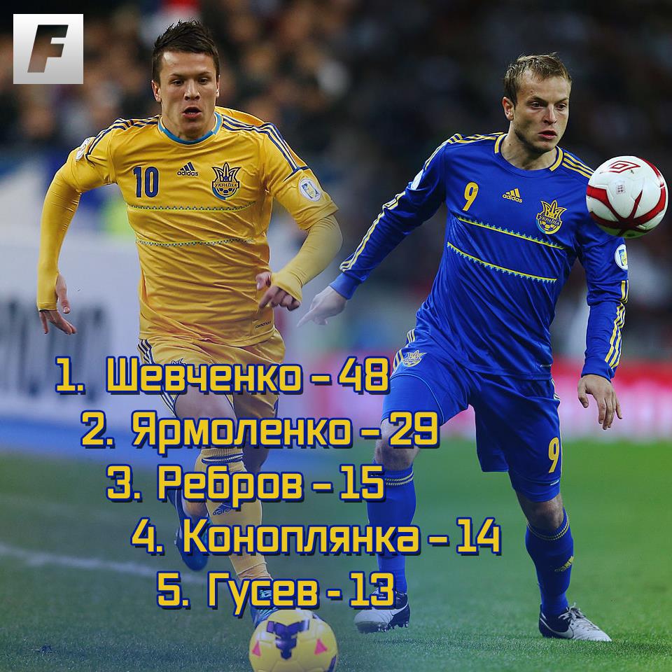 Теперь Евгению остался всего один гол, чтобы догнать Сергея Реброва (15). У Андрея Ярмоленко 29 мячей в футболке сборной, а лучшим бомбардиром является нынешний главный тренер команды Андрей Шевченко (48).