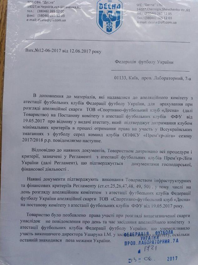 Заздалегідь дякую за розуміння та сподіваюсь, що Федерація футболу України всіма можливими законними засобами зможе відсояти право Спортивно-футбольного клубу Десна приймати участь у Всеукраїнських змаганнях з футболу серед команд клубів ОПФКУ Прем’єр-ліга сезону 2017/2018 р.р”.