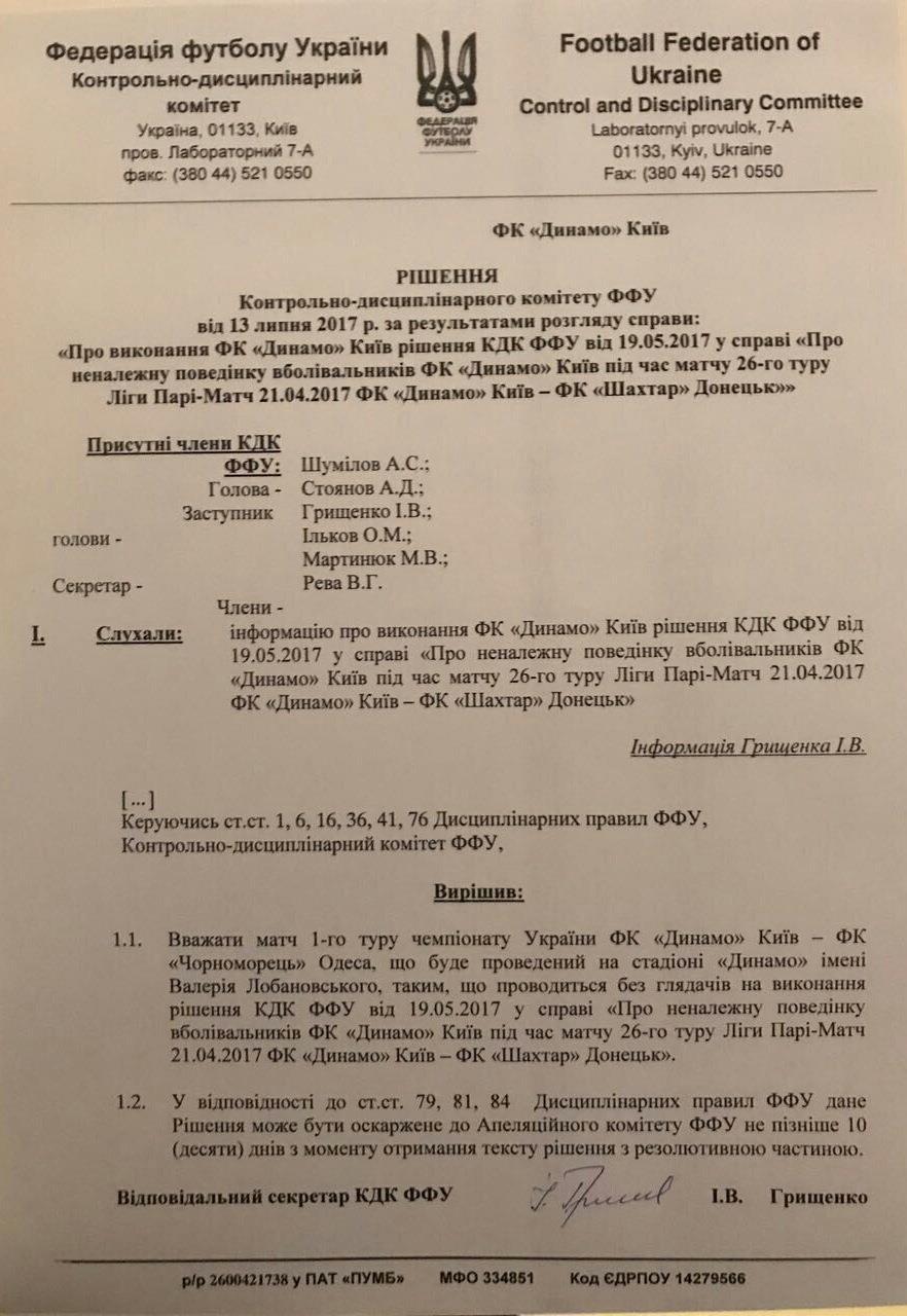 На заседании КДК ФФУ, которое состоялось 13-го июля, было принято решение наказать Динамо.