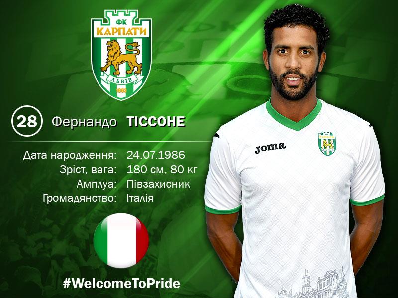 Карпаты заключили контракт с 31-летним итальянцем Фернандо Тиссоне. Об этом сообщает официальный сайт "львов". Футболист практически всю свою футбольную карьеру провел в Италии и Испании. Последним клубом Тиссоне была Малага.