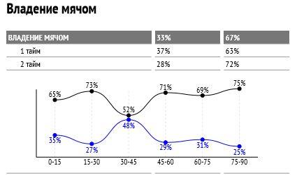 Кроме того, "горняки" превзошли соперника и в количестве организованных атак – 97 против 67-ми. Что же касается такого показателя, как владение мячом, то в целом за матч он составил 33% у хозяев против 67% у гостей.