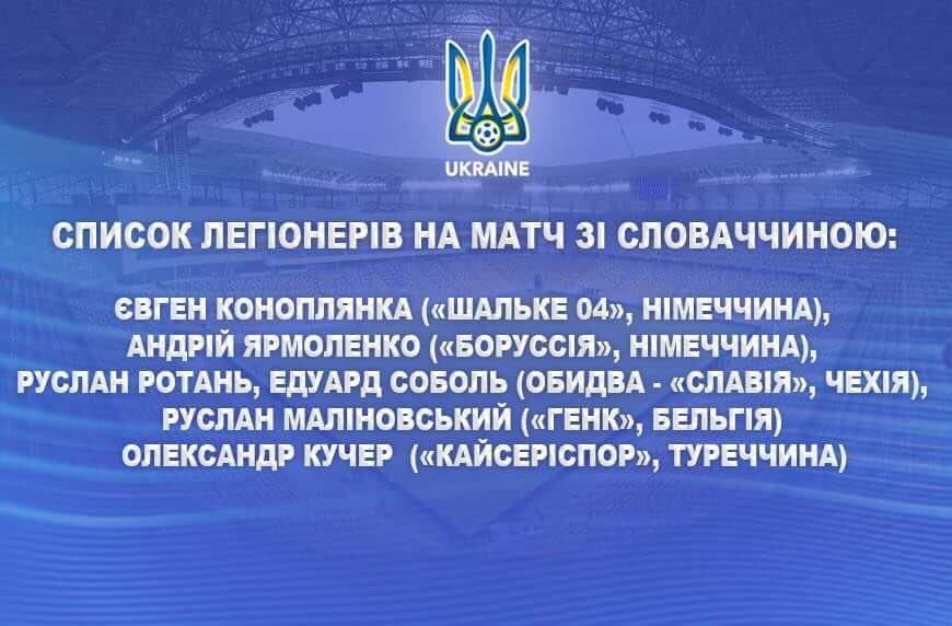 Количество легионеров, на которых рассчитывает тренер сборной Украины Андрей Шевченко в товарищеском поединке против Словакии, по сравнению с заключительными отборочными матчами ЧМ-2018 уменьшилось на одного человека.