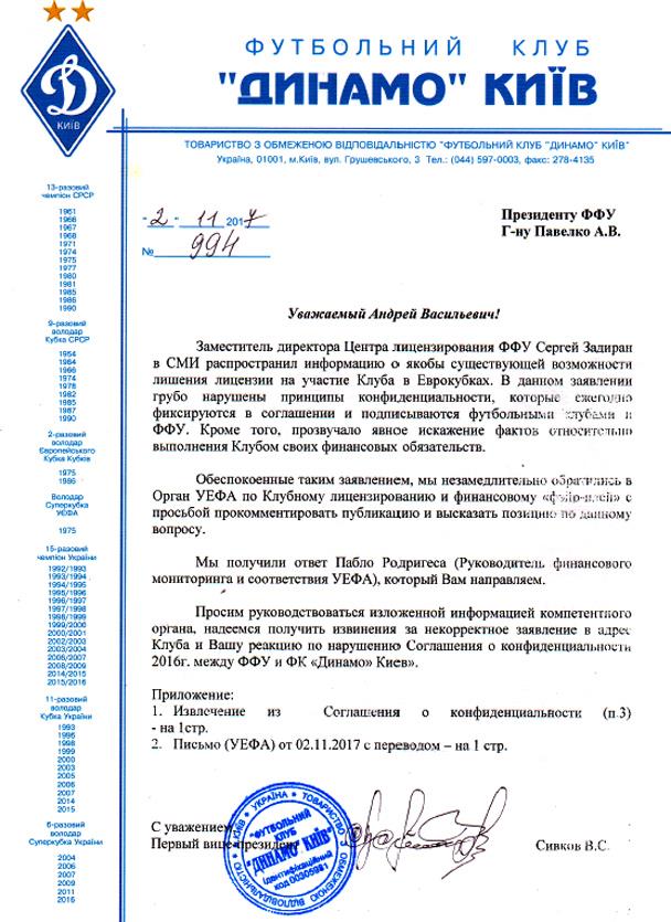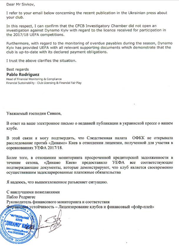 Киевский клуб предоставил письмо из УЕФА, подтверждающее, что клубу не грозит лишение лицензии на участие в еврокубках.