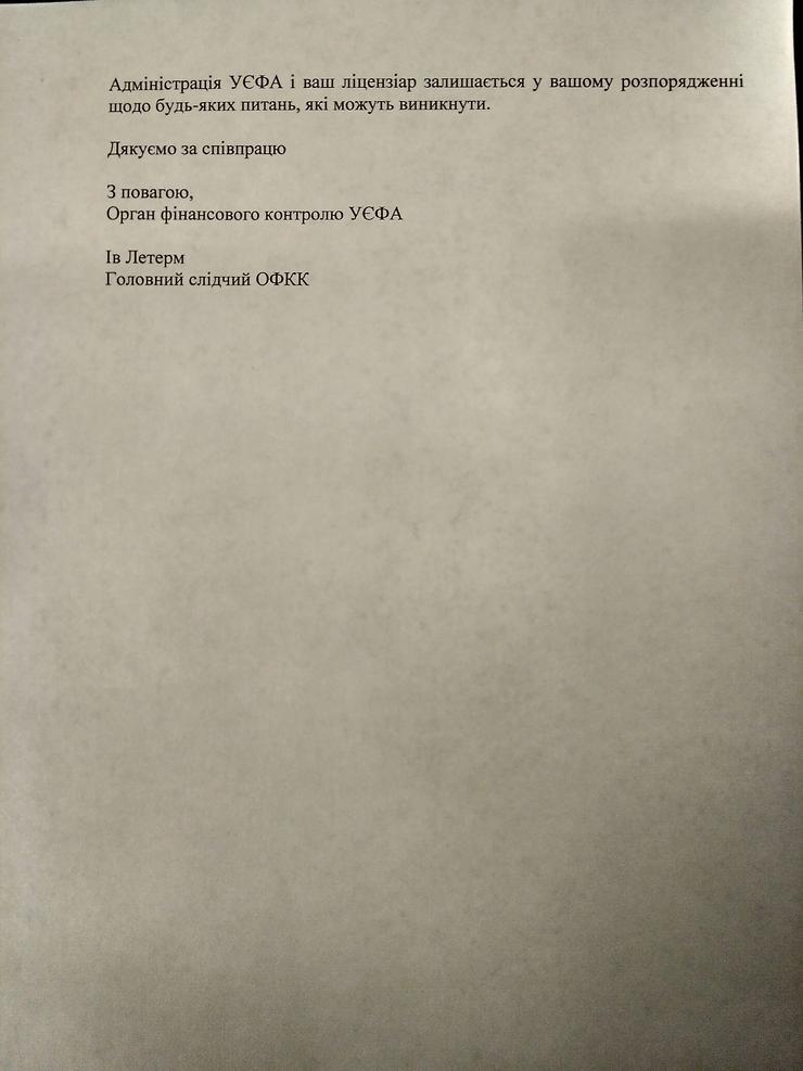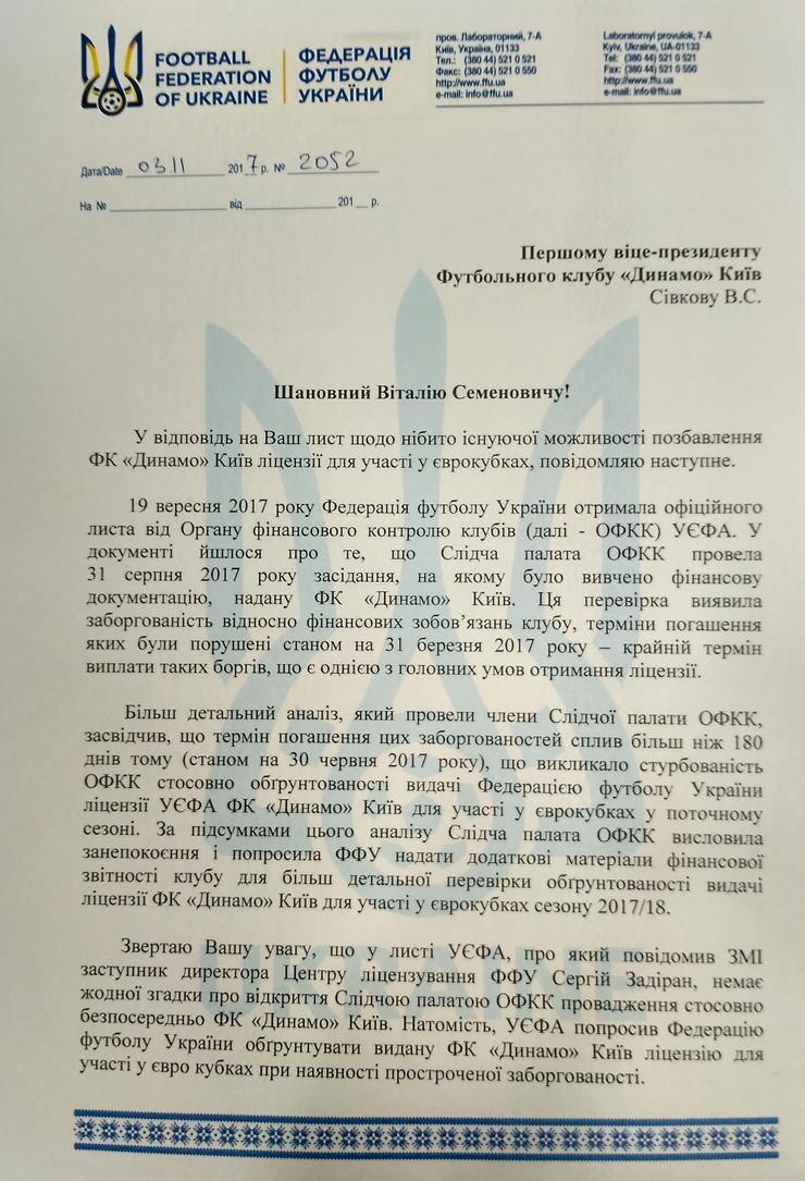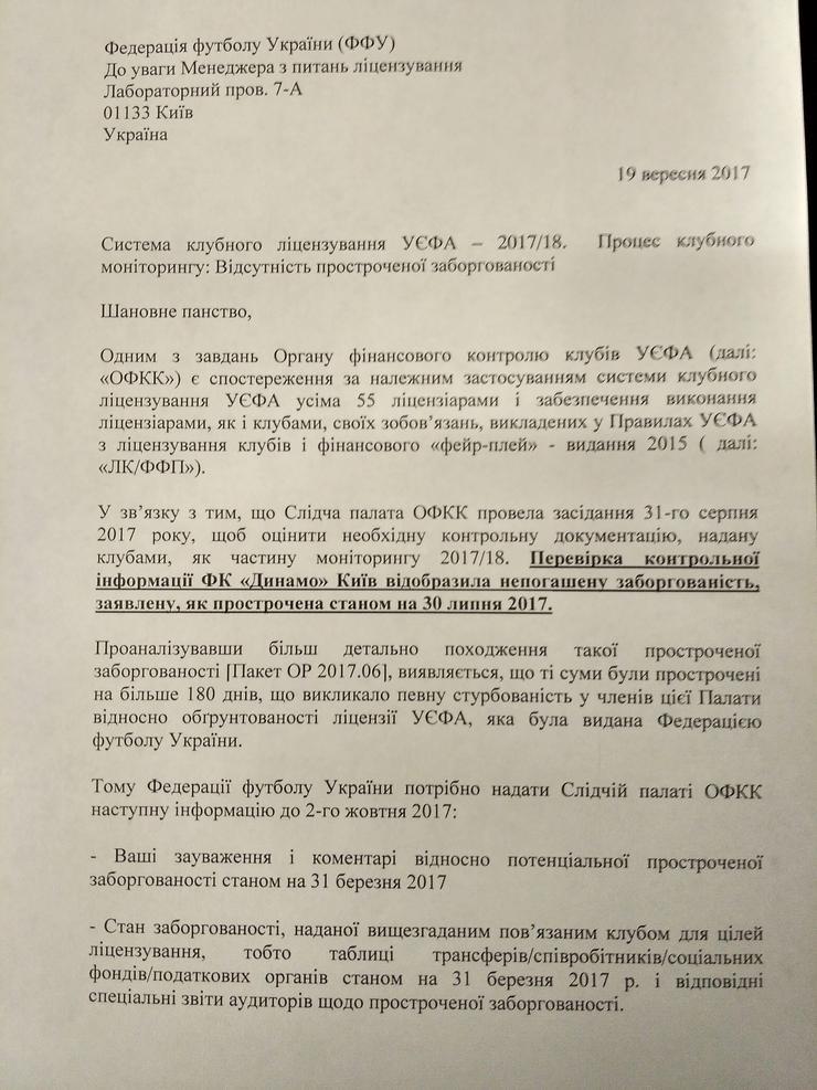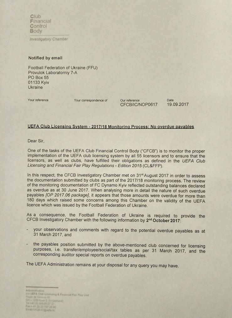 "19 сентября 2017 Федерация футбола Украины получила официальное письмо от органа финансового контроля клубов (далее ОФКК) УЕФА. В документе говорилось, что Следственная палата ОФКК 31 августа провела заседание, на котором было изучено финансовую документацию, предоставленную клубом Динамо Киев.