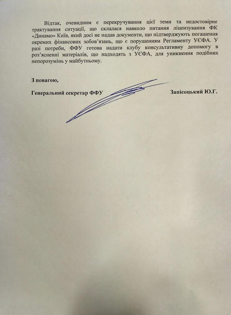 "Очевидными являются искажения этой темы и недостоверная трактовка ситуации, сложившейся вокруг вопроса лицензирования столичного клуба, который до сих пор не предоставил документы, подтверждающие погашение отдельных финансовых обязательств, что является нарушением Регламента УЕФА. ФФУ готова предоставить Динамо Киев консультативную помощь в разъяснении материалов, поступающих с УЕФА, во избежание подобных недоразумений в будущем".