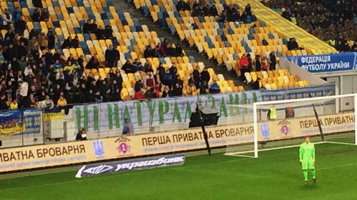На секторе за одними из ворот болельщики вывесили баннер, на котором написано "Ні натуралізації".