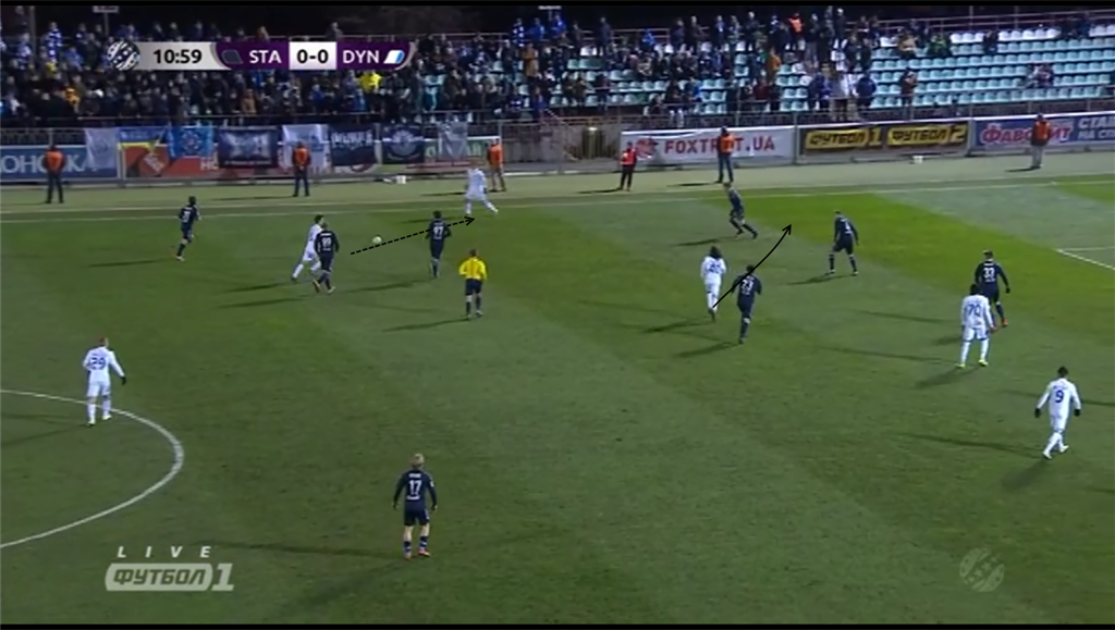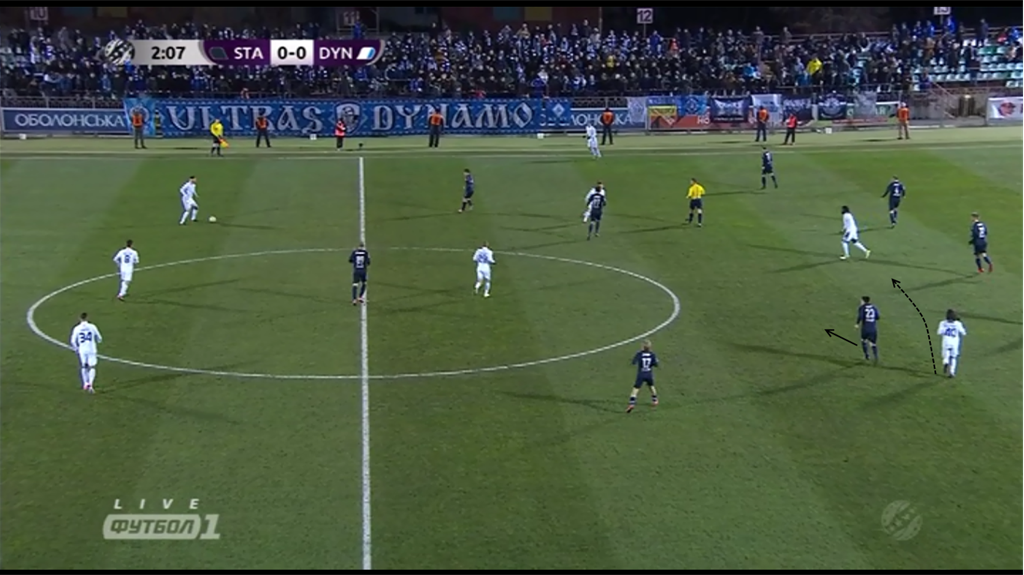 Еще на летних сборах было видно, что Хацкевич отказался от большого процента владения и тотального контроля мяча. В товарищеских матчах и на старте сезона Динамо строило атаки вообще без центра поля, используя фланги и забросы. Сейчас мы наблюдаем что-то среднее межу футболом Реброва и Хацкевича летом: центр поля снова играет важную роль при организации атакующих действий, но при этом игроки все равно пытаются доставлять мяч к воротам противника быстрее.