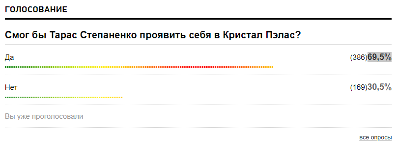 Основная часть проголосовавших (69,5%) считают, что полузащитник Шахтера Тарас Степаненко мог бы проявиль себя в составе Кристал Пэлас.