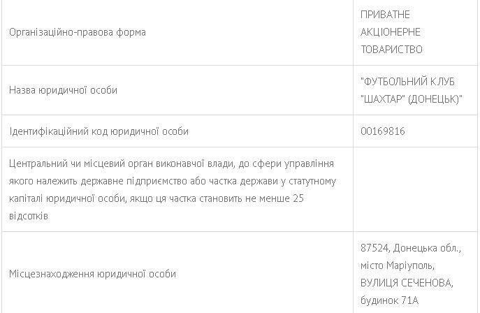 Частное акционерное общество "Футбольный клуб Шахтер (Донецк)" от теперь зарегистрировано по адресу Мариуполь, ул. Сеченова 71 А.
