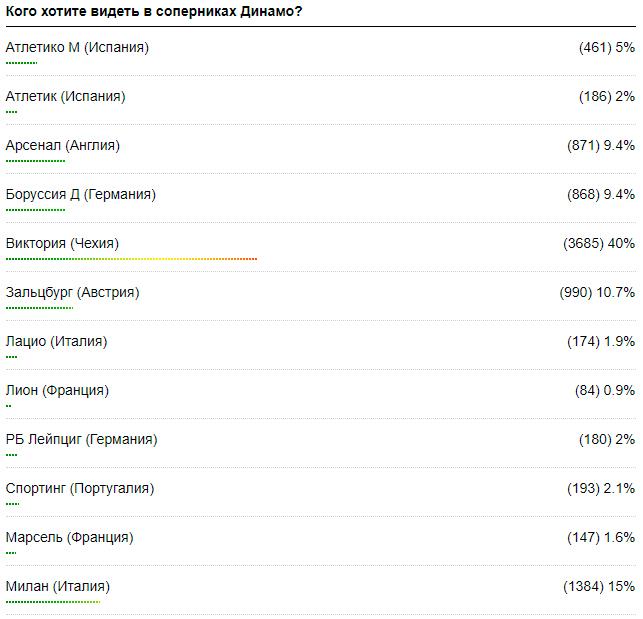 Football.ua провел голосование среди своих подписчиков "Кого хотите видеть в соперниках Динамо?". Наибольшее количество голосов получила Виктория Плзень (40%). Второе место занял Милан (15%), и третье Зальцбург (10,7%). Практически идентичные показатели у Арсенала и Боруссии Д.