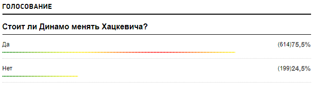 Читатели Football.ua считают, что киевскому Динамо стоит сменить главного тренера Александра Хацкевича. Такое мнение высказали 75,5% проголосовавших пользователей.