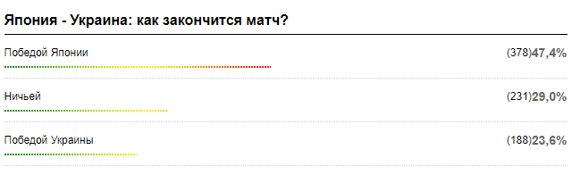 За победу украинцев проголосовали 23,6% участников опроса. За ничью – 29,0%. А 47,4% респондентов считает, что японская сборная увезет из Льежа победу.