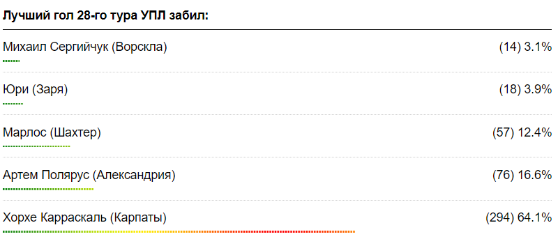За гол Хохе Карраскаля в ворота Черноморца проголосовало 64,1% пользователей Football.ua. На втором месте с 16,6% Артем Полярус из Александрии, а замкнул тройку лидер Шахтера Марлос (12,4%).