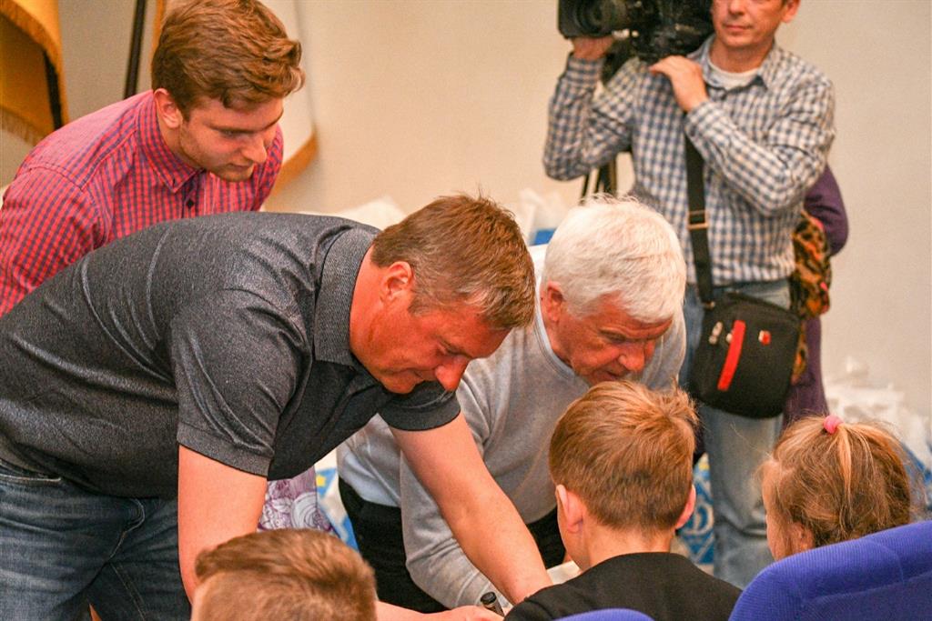 В гости к юной аудитории пришел президент "бело-синих" Игорь Суркис, главный тренер Александр Хацкевич, капитан команды Сергей Сидорчук и вице-капитан Виктор Цыганков, а также легендарный полузащитник Динамо прошлого века – Владимир Мунтян и член правления Динамо Матвей Замиховский.