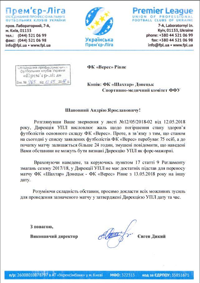 Верес прибыл на матч тридцать первого тура чемпионата Украины против Шахтера в Харьков, однако из-за массового отравления футболистов отправил письмо в УПЛ с просьбой о переносе матча.