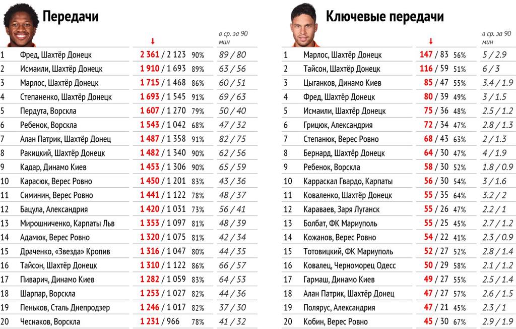 Далее в списке идут еще три игрока Шахтера: Исмаили (1910/1693, 89%), Марлос (1715/1468, 86%) и Степаненко (1693/1545, 91%). На пятой позиции защитник Ворсклы Пердута (1607/1270, 79%).