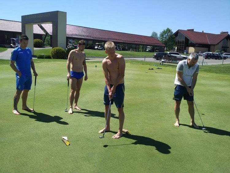 Как сообщает официальный сайт ФФУ, футболисты сборной Украины получили возможность отдохнуть в первой половине шестого подготовительного дня. С утра команда прогулялась по холмам гольф-поля. После чего, Евгений Коноплянка, Александр Зинченко, Евгений Селезнев, а вместе с ними и шеф-повар сборной Украины Любомир Тошич решили начать освоение гольфа на мини-поле.