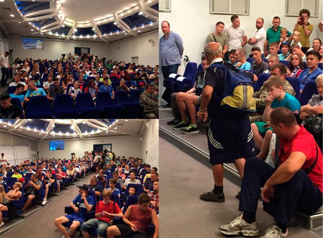 Что касаемо фанатов, лично я пришел на мероприятие за 25 минут до его начала, но уже тогда свободных мест в конференц-зале стадиона Динамо имени Лобановского уже не было. Пришли на встречу с игроками разные категории фанатов: от "первоклассников" до опытных фанатов и самого Парамона.
