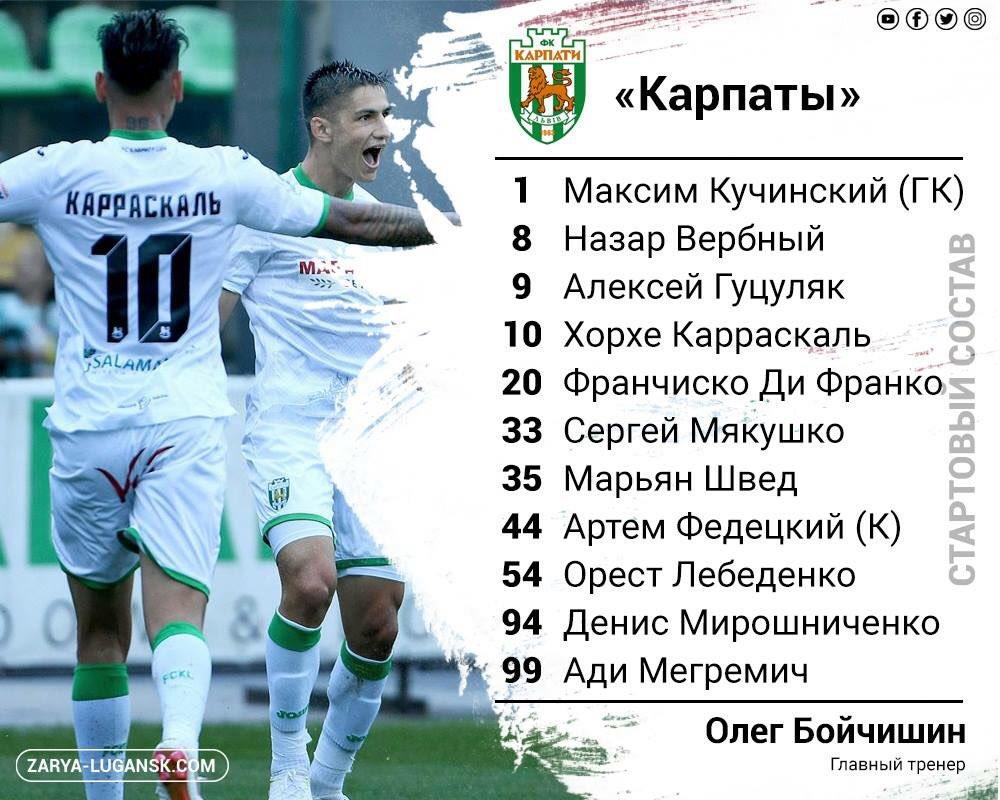 Карпаты: Кучинский — Мирошниченко, Федецкий, Мехремич, Лебеденко — Вербный, Гуцуляк — Мякушко, Ди Франко, Карраскаль — Швед