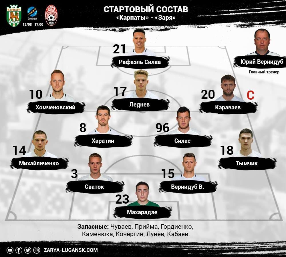 Заря: Махарадзе — Тымчик, Вернидуб, Сваток, Михайличенко — Силас, Харатин — Караваев, Леднев, Хомченовский — Рафаэль .
