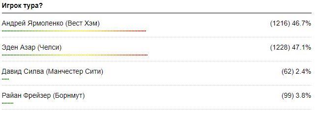 Борьба между Андреем Ярмоленко и Эденом Азаром развязалась не на шутку и бельгиец набрал всего на 12 голосов (0,4%) больше, чем украинец.
