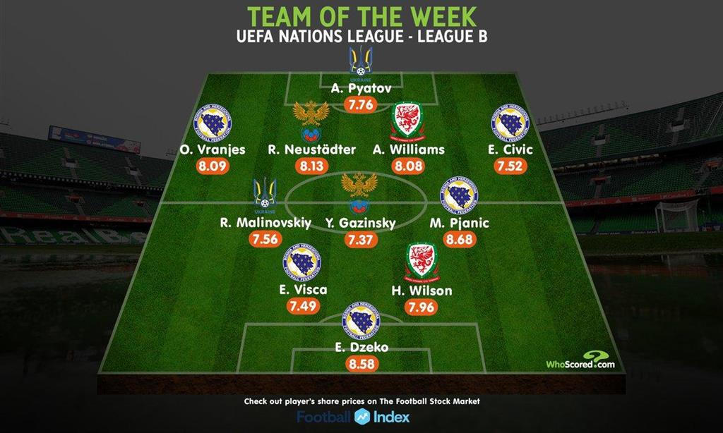Также в сборную вошли пять представителей Боснии и Герцоговины: Враньеш, Цивич, Пьянич, Виска и Джеко, и по два представителя Уэльса и России: Уильямс, Уилсон, Газинский и Нойштедтер.