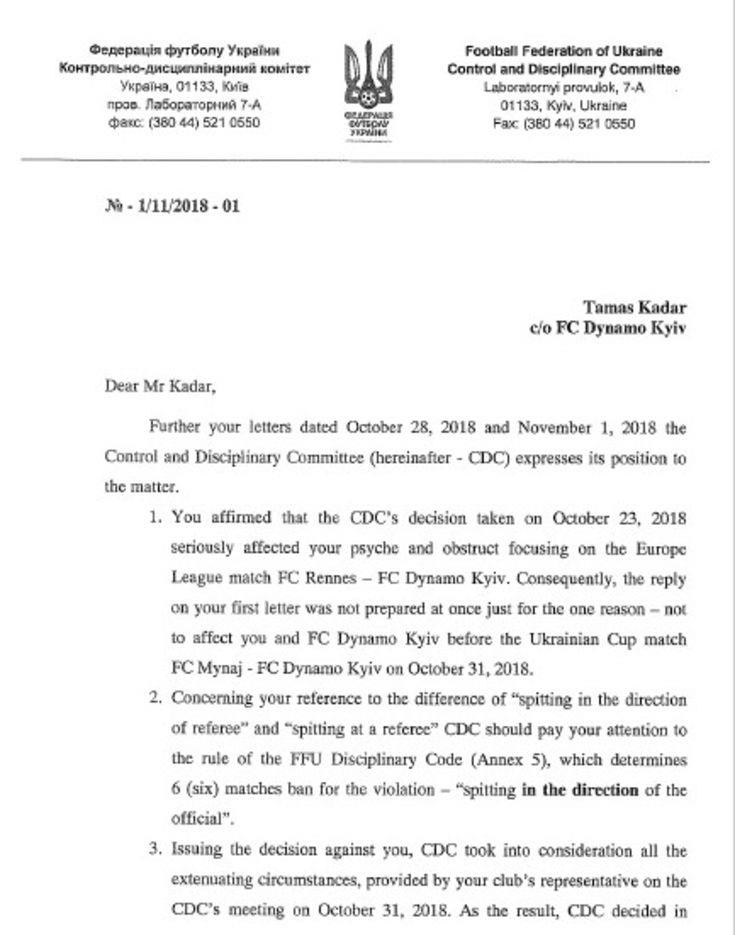 Защитник киевского Динамо Тамаш Кадар в последнее время отправил два официальных письма (первое и второе) в КДК ФФУ с просьбой пересмотреть его дисквалификацию на три матча.