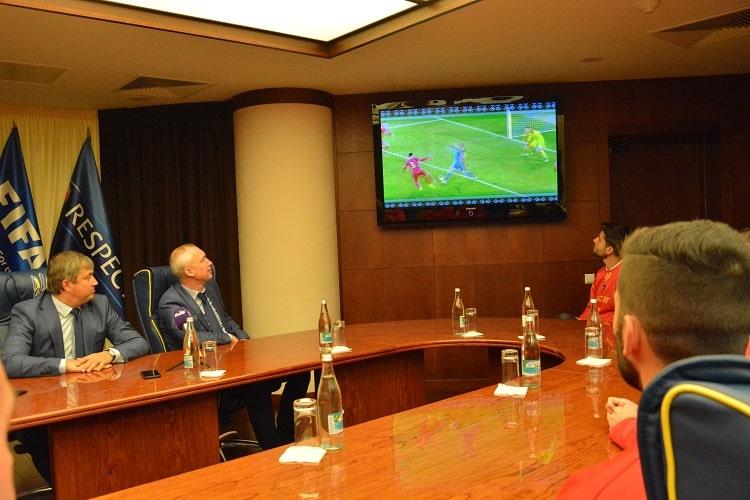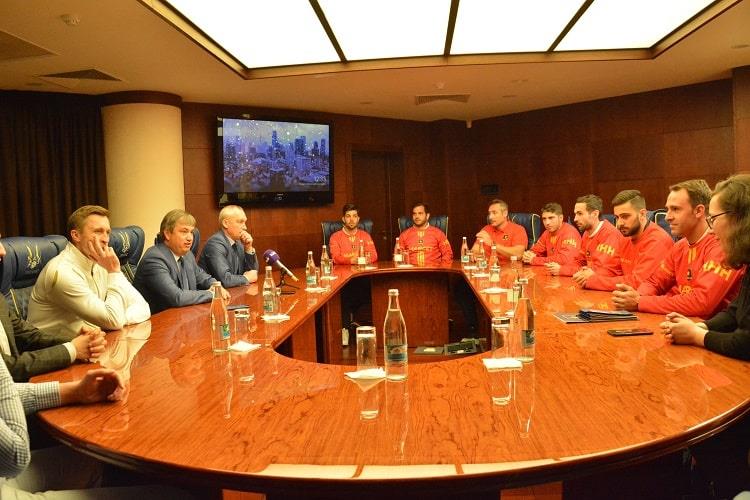На завершення презентації гості з Іспанії отримали з рук керівництва ФФУ футбольні презенти та зробили колективне фото на згадку про візит до України.