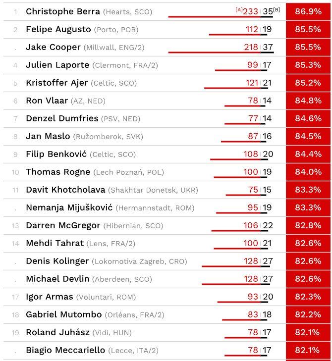 Лидером является Кристофер Берра из шотландского Хартса — 233 выигранных из 268 (86,9%).