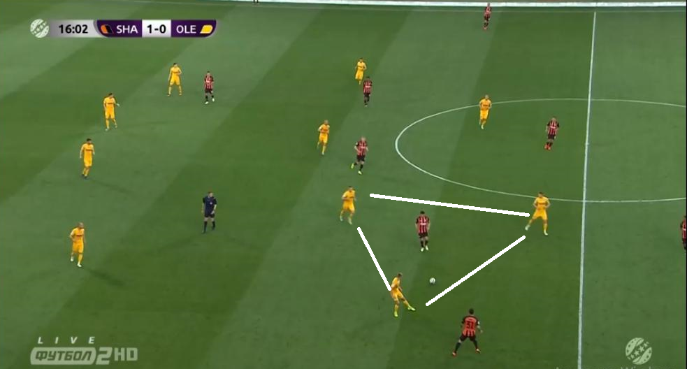 Шаран очень внимательно отнесся к фланговым атакующим футболистам Шахтера. Таким образом, Александрия встречала соперника на фланге такими себе треугольником, состоящие из крайнего защитника, крайнего полузащитника и центрального полузащитника. Сдерживать позиционную атаку Шахтера в первом тайме у александрийцев получалось очень даже хорошо. Шахтер так и не создал моментов с игры, но у Фонсеки был козырь...