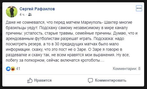 "Даже не сомневался, что перед матчем Мариуполь — Шахтер многие бразильцы уедут. Подскажу самому независимому в мире каналу причины: усталость, старые травмы, семейные причины. Думаю, что и арендованным футболистам разрешат играть. Подсказка: надо посмотреть резерв, а то в 30 предыдущих матчах было мало информации. скажу, что это пост не о Заре. О Заре я говорю в раздевалке и скажу так, не всем нравятся мои выражения. Ну все, побегу за попкорном, сейчас включатся кротоботы", — написал на своей странице в Facebook Сергей Рафаилов.
