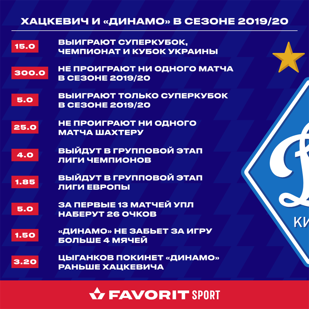 Но в первую очередь болельщики ждут, конечно же, трофеев. Лучше всего, если это будут победы и в чемпионате, и в Кубке Украины. Специалисты Favorit Sport предлагают на такой исход коэффициент 7,0. Само собой, с учетом того, что этих результатов команда добьется вместе с Хацкевичем. Если же к наградам добавится и Суперкубок, то коэффициент значительно выше — 15,0.