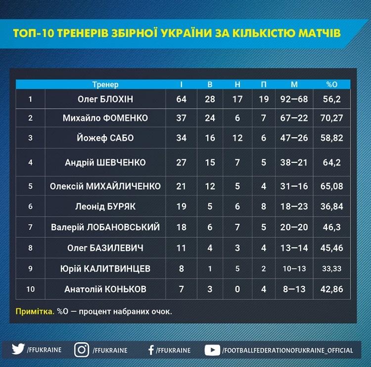 На первом месте находится Олег Блохин, который руководил сборной в два периода (2003-2007; 2011-2012) и провел 64 поединка. В первый период работы Олега Владимировича сборная Украины достигла наивысшего своего достижения в истории, а именно — выход в 1/4 финала чемпионата мира-2006.