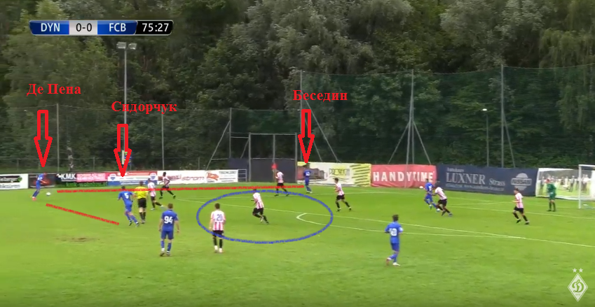 Динамовцам не удается быстро воплотить перехват в голевой момент. Таким образом, атака превращается в позиционное наступление: Беседин отдает назад Де Пене, а тот отпасовывает назад по диагонали Сидорчуку, который в итоге ошибся. Но дело не в обрезке опорного полузащитника Динамо, а в том, что в середине всей этой конструкции никого нет (отмечена зона синим кругом).