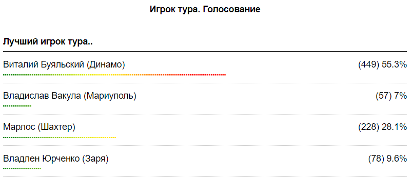 С огромным отрывом победу одержал хавбек киевского Динамо Виталий Буяльский, за чью кандидатуру проголосовало 55,3% респондентов.