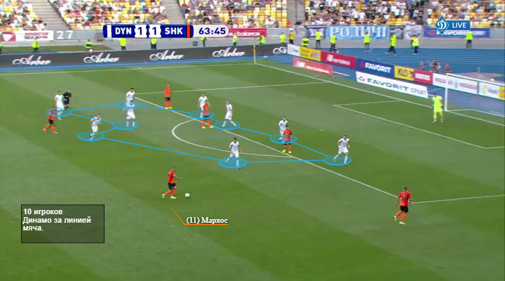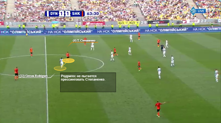 6. Динамо отказалось от прессинга, и несколько удивила инертность Жерсона в этом компоненте. Однако, похоже, что нападающего от работы против мяча освободил тренерский штаб. Родригес не прессинговал защитников Шахтера, не препятствовал им разыгрывать мяч.