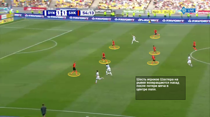 4. Если с позиционными атаками у Шахтера еще не до конца ладится, то отметим один компонент, который помог нейтрализовать потенциал Динамо в атаке — быстрый переход из атаки в оборону. Речь о том, как команда возвращается назад после потери мяча. Этим самым "горняки" лишили киевлян возможности доводить контратаки хотя бы до ударов, а попыток контрвыпадов у Динамо насобиралось пять.
