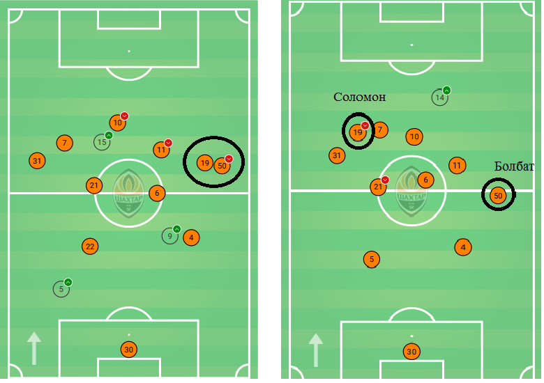 Действительно, Шахтер позаботился о том, чтобы "перекрыть кислород" левому защитнику Динамо. Если же, в игре за Суперкубок Сергею Болбату был отдан весь фланг, а Манор Соломон играл ближе к левому полуфлангу, то в игре чемпионата израильтянин действовал справа на бровке или же в правом полуфланге. К тому же, если мы посмотрим на усредненные позиции игроков Шахтера, то увидим и вовсе, что Соломон играл на одной линии с Болбатом, думая об обороне.