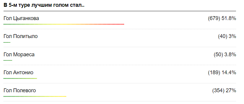Гол Цыганкова набрал больше половины всех голосов, фактически не оставив шансов своим преследователям. На втором месте оказался гол Владимира Полевого в ворота ФК Львов.