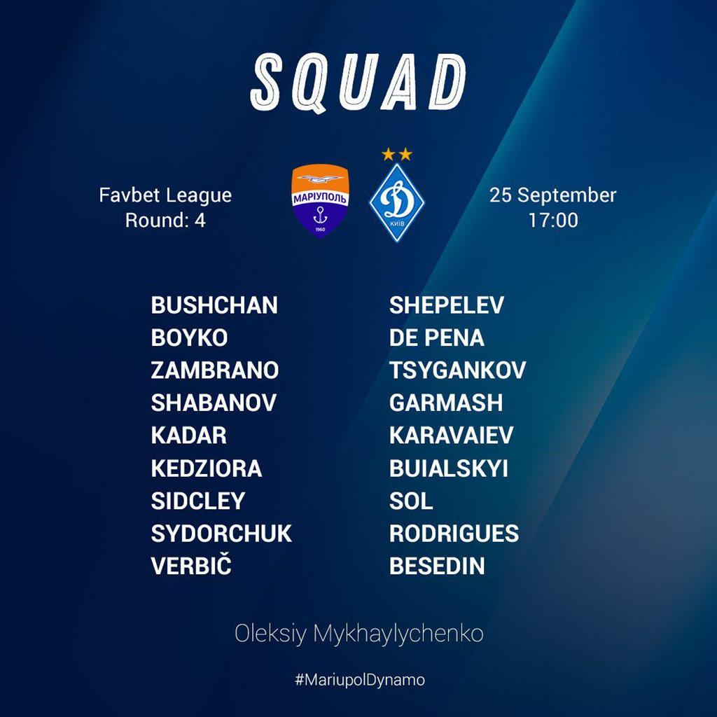 Как и сообщал врач Динамо, Виталий Миколенко получил возможность отдохнуть и не поехал в Мариуполь. Нет в списке 18-ти и Йосипа Пиварича, но есть бразильский защитник Сидклей.