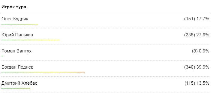 За Богдана отдали свои голоса 340 (39,9%) наших читателей, принявших участие в опросе. На втором месте вратарь Александрии Юрий Панькив — 238 (27,9%), а замкнул тройку призеров его коллега из Карпат Олег Кудрик — 151 (17,7%).
