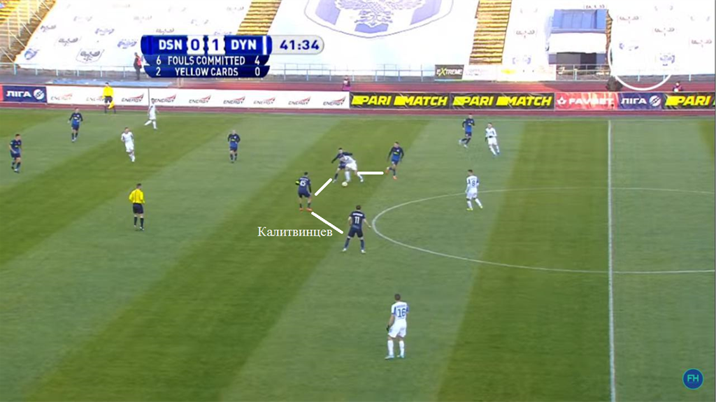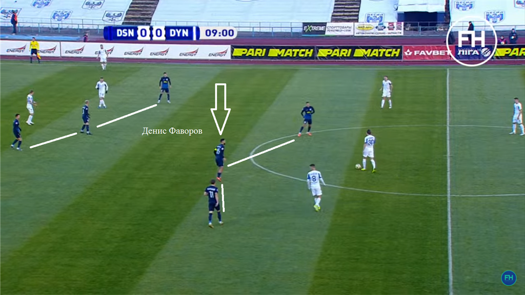 3. Динамо в первом тайме порой “вынуждало” Десну играть первым номером, что далеко не самая сильная сторона команды Александра Рябоконя. К тому же, гости достаточно дозировано шли в высокий прессинг. Буяльский выдвигался ближе к Солю, чтобы перекрывать возможные направления для передач.