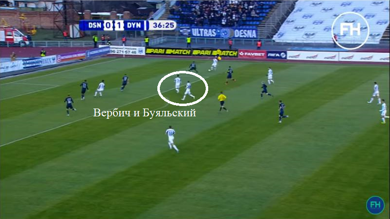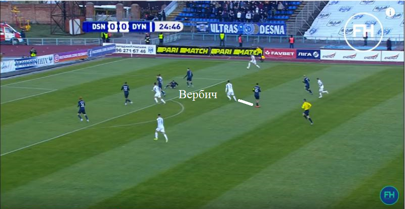 4. Игроки Динамо здорово находили пространство между линиями на подступах к штрафной площади Десны. Здесь у Рябоконя должны быть большие вопросы к опорным полузащитникам. Отсюда, к слову пришел и забитый гол Цыганкова. Вербич сместился с левого фланга в правый полуфланг и отклеился от Дениса Фаворова. К слову, подобные перемещения словенца появились именно при Алексее Михайличенко.