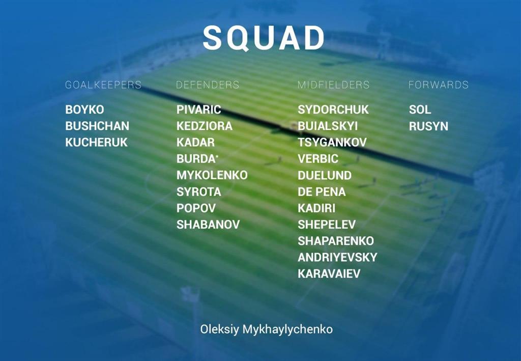 В списке игроков отсутствует новичок Динамо Каргбо, открывший счет своим голам на первом сборе, но получивший травму. Зато вместе с командой летит Бурда, продолжающий восстановление после травмы.