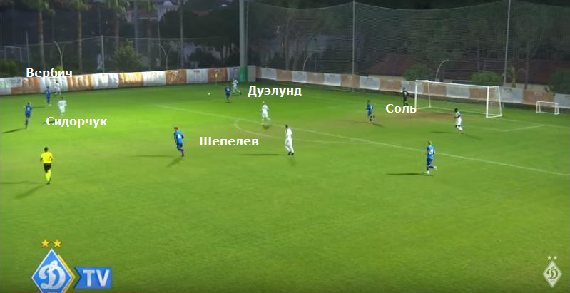 Динамо накрывало соперника у его же штрафной площади пятью-шестью футболистами. На стопкадре ниже пример с забитым голом. Футболисты Динамо накрыли возможных адресатов для передачи, а Дуэлунд вынудил соперника быстрее избавиться от мяча. Интересно, будут ли попытки прессинга Динамо эффективны с командами, которые умеют выходить из под высокого блока. Однако таких соперников во второй части сезона у Динамо не будет.