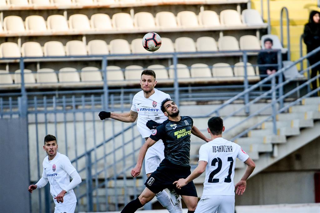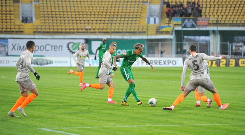 Достаточно комфортной погодой для игры в футбол встретило Запорожье команды. Однако игроки не воспользовались созданными для них условиями в первом тайме, организовав лишь по одному серьезному моменту с каждой из сторон. Первопричиной такой ситуации стала замкнутая игра гостей на своей половине поля. Подопечные Висенте Гомеса попробовали провести свою первую акцентированную атаку лишь под занавес 45-и игровых минут и вполне могли выйти вперед на этой волне непривычной для них активности. Повезло Заури Махарадзе, что мяч после удара головой с близкой дистанции от Зотько последовал именно по центру ворот.